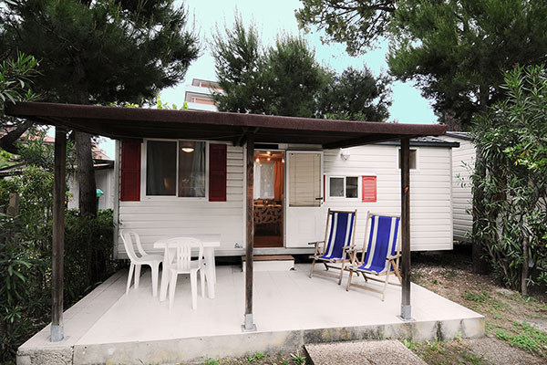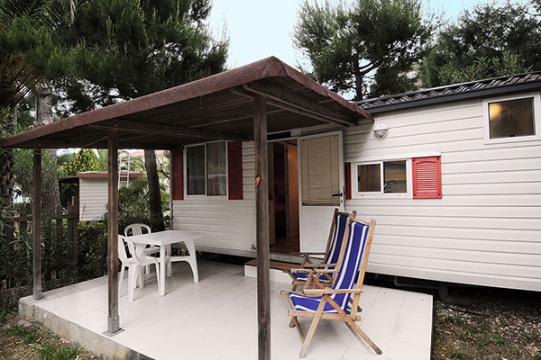 Comprende camera matrimoniale, cameretta con due letti singoli, soggiorno-pranzo con angolo cottura completo di lavello e frigo, bagno con wc, lavandino e doccia, acqua calda, aria condizionata, veranda con pergolato, giardino e parcheggio auto riservato ombreggiato. Completamente arredato compresa attrezzatura da cucina.