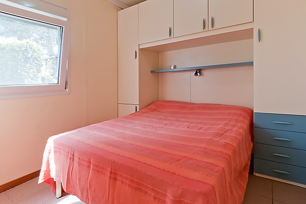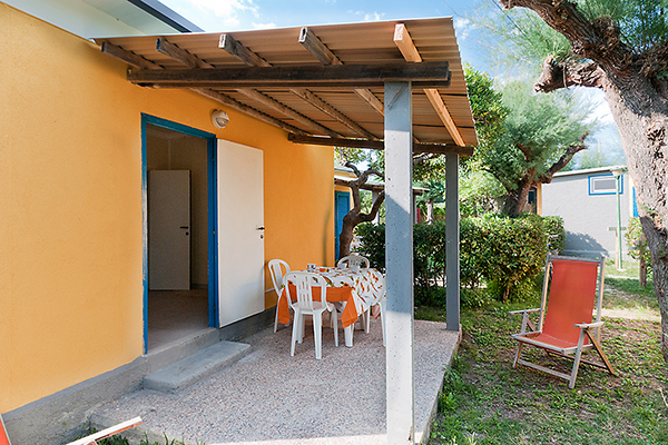 Comprende camera matrimoniale, cameretta con due letti singoli, soggiorno-pranzo con angolo cottura completo di lavello e frigo, servizio wc con lavandino e doccia, acqua calda, aria condizionata, veranda con pergolato, giardino e parcheggio auto riservato ombreggiato. Completamente arredato compresa attrezzatura da cucina.